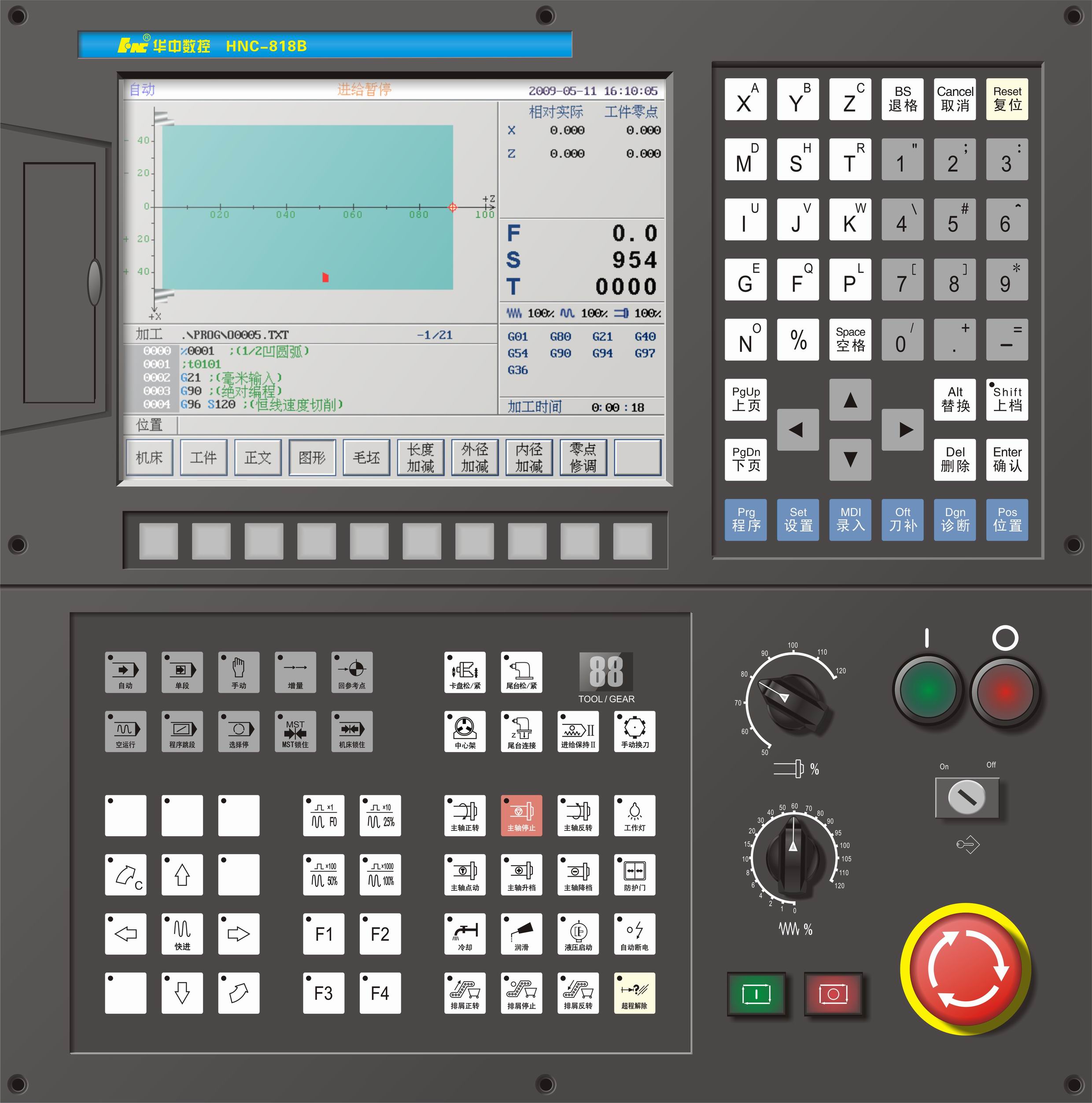 T42車削中心改造主要應(yīng)用華中HNC-818B/T數(shù)控系統(tǒng)的兩軸聯(lián)動功能、C/S軸切換功能、進(jìn)給軸轉(zhuǎn)主軸功能、直線插補(bǔ)功能、圓弧插補(bǔ)功能、螺紋加工功能、第二主軸功能、第一主軸轉(zhuǎn)換成伺服軸參與插補(bǔ)功能、坐標(biāo)系設(shè)定功能、MDI及M、S、T功能、加工圖形仿真功能、固定循環(huán)功能等。
