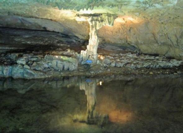 跟著導游走了沒多遠,就上了游艇。游艇在昏暗的燈光指引下慢慢向洞的深處游去,一個個奇異造型的鐘乳石映入眼簾,在燈光的照射下發出璀燦的光芒。游客們都發出嘖嘖的贊嘆聲。感嘆大自然的神奇。